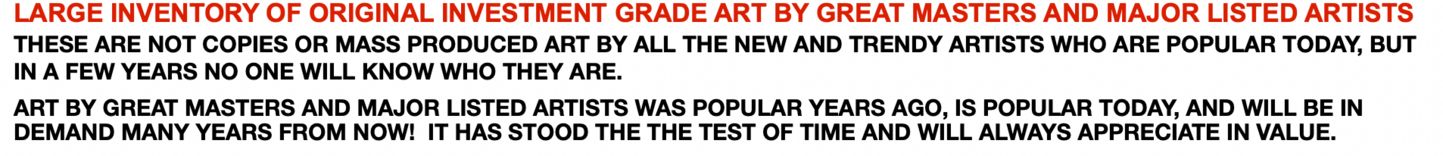 ALL WORLD ART GALLERY, ENTIRE INVENTORY FOR SALE FOR PENNIES ON THE DOLLAR . LIQUIDATING ONE OF THE LARGEST INVENTORIES OF ORIGINAL INVESTMENT GRADE MODERN & ANTIQUE PAINTINGS, DRAWINGS, LITHOGRAPHS, POSTERS, ART BOOKS. GREAT INVESTMENT OPPORTUNITY CALL 646 290 0413, DEERFIELD BEACH, FL. 33441 ALLWORLDART@GMAIL.COM TO SEE ITEMS AND PRICES, GO TO: investorartgallery.com